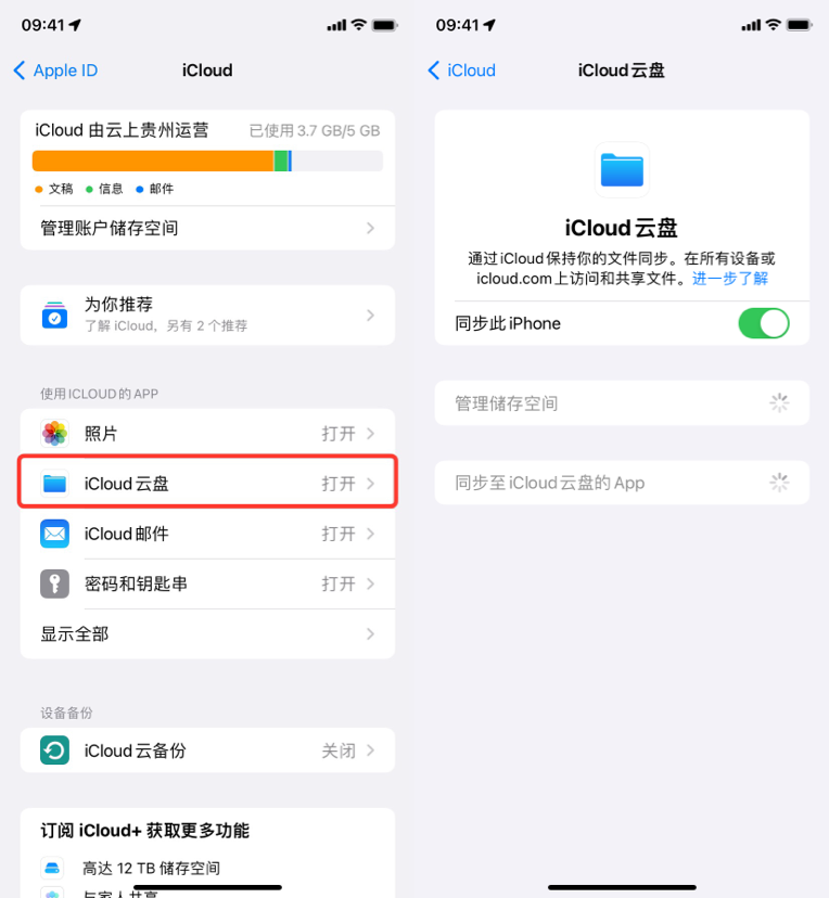 前往系统设置>Apple ID>iCloud>iCloud云盘,然后打开iCloud云盘开关。